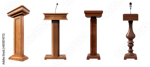 brown wood speech stand and microphone - Podium set - lectern collection - various shapes and angles - isolated transparent PNG. Modern and antique.