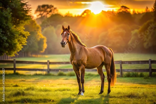 brown horse, paddock, dusk, golden hour, tranquil, serene, nature, equine, outdoors, animal portrait, rural, farm, countryside, peaceful, shadow, twilight, greenery, wildlife, dark background, soft light, equestrian, landscape, natural light, soft focus, grass, tranquil scene, evening light, photo