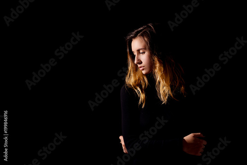 Brown-haired woman in black crossed on her arms and looking down on a black background with space for text