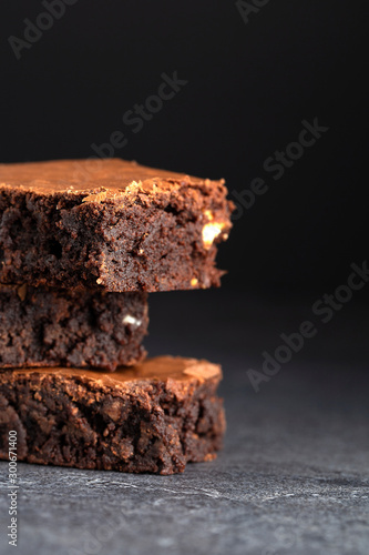 brownies chocolate three stacked on grey background extreme close up