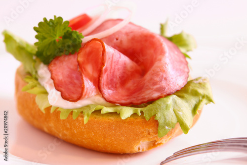 bread roll, pepperoni, sausage, salad, lettuce, meat, vegetable, curd, cheese, bread, food, breakfast, break, proven, snack, sandwich, fresh, crunchy, tomatoes, onion, parsley, plate