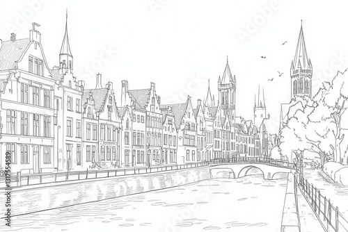 Bruges Canal Line Art Coloring Page - A charming line art coloring page depicting a picturesque canal scene in Bruges, Belgium. Symbolizing tranquility, history, architecture, travel, and artistry