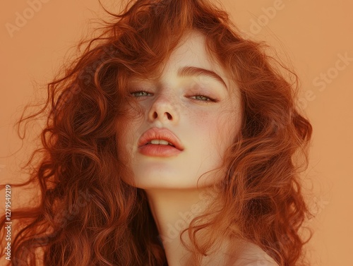 Brunette Beauty: Curly Wavy Hairstyle with Volume, Natural Makeup, and Fashionable Elegance Against a Soft Beige Background