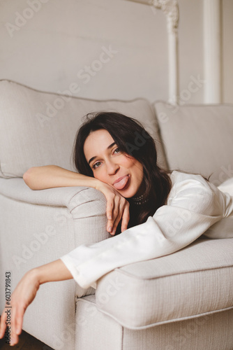 Brunette curl hair woman wear white long dress with one shoulder sleeve and pearl necklace. Women's health, sexuality. Girl look sexy and sensual. Elegant look. Woman lying on sofa and show tongue