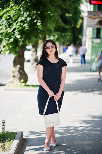 Brunette girl at black dress on sunglasses with handbag at hand posing at street of city.