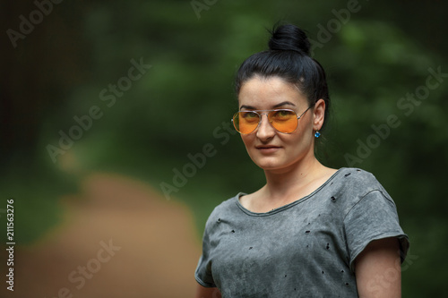 Brunette girl in green shirt and in yellow glasses in the forest in summer.