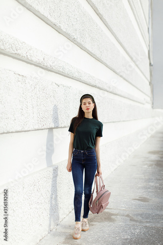 Brunette girl in jeans, a green T-shirt, a hair band and a pink backpack stands against a white wall