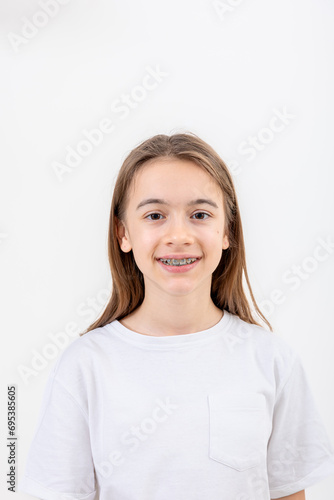 girl, teenage, children, braces, teeth, smile, health, dental, orthodontic, medicals, isolated, brunette, portrait, white, happy