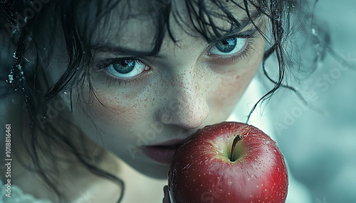 sin, girl, freckle, brunette, apple, red apple, blue eye, fruit, woman, food, face, red, eating, bite, closeup, eye, diet, healthy, lip, model, people, person, health, skin, beauty, cosmetic, sensuality