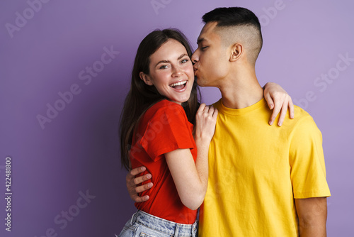 man, woman, couple, adult, young, european, kiss, hugging, happiness, smile, laugh, t-shirt, brunette, look, indoor, studio, 2, people