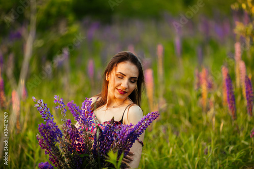 brunette in a flower field.The girl holds lupines purple