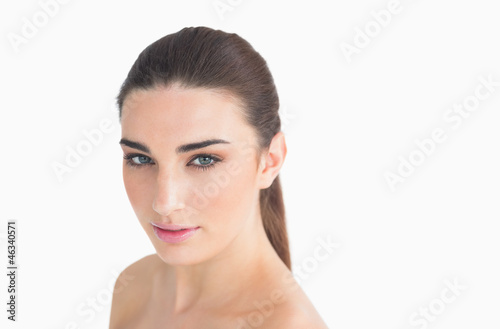 20s, young adult, woman, female, caucasian, indoor, white background, copy space, head shot, attractive, beautiful, beauty, care, clean, cute, fresh, make-up, model, natural, honed, pretty, posing, smiling, happy, face, gorgeous, looking, portrait, sexy, brunette, brown hair