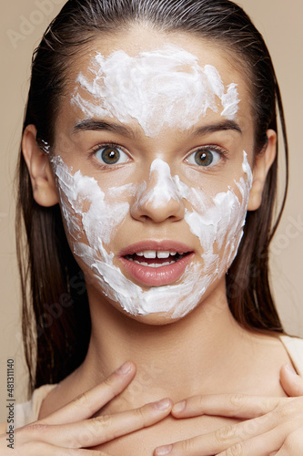 brunette with moisturizer on the cheeks in the eye area Youth and Skin Care Concept