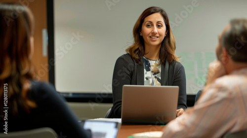 woman, brunette, laptop, presentation, colleague, lighting, engage, business, meeting, technology, communication, office