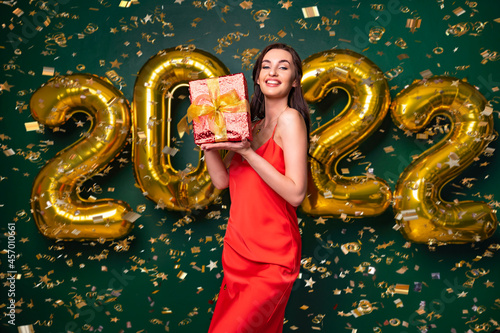 2022, gift, box, celebration, woman, holiday, holding, birthday, new year, celebrate, christmas, day, dress, wish, present, female, festival, pretty, young, happiness, happy, hand, black, green, background, gift box, brunette, adult, surprise, paper, package, event, christmas, festive, studio photography, joy, joyful, lady, fashionable, shopping, attractive, studio, looking, surprised, party, beauty, beautiful, style, caucasian, sexy