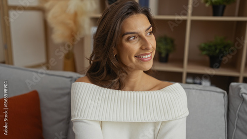 Brunette woman smiling in cozy living room with modern decor, featuring plush sofa and shelves with plants, conveying warmth and relaxation during daytime.