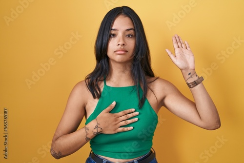 Brunette woman standing over yellow background swearing with hand on chest and open palm, making a loyalty promise oath