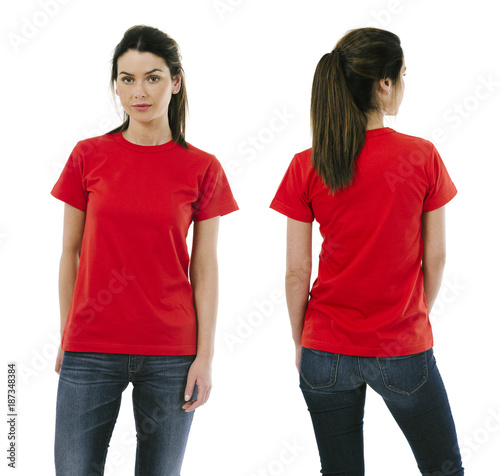 t-shirt, isolated, red, 1, front, back, model, blank, woman, fashion, standing, white background, clothing, shirt, person, studio, cotton, female, top, t-shirt, clothes, adult, smiling, posing, jean