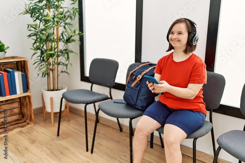 Brunette woman with down syndrome sitting using smartphone wearing headphones at waiting room