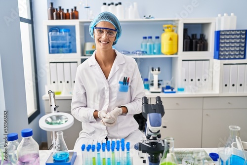 Brunette woman working at scientist laboratory with hands together and crossed fingers smiling relaxed and cheerful. success and optimistic