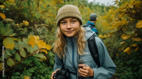 Brunette Youth Exploring Radiant Woods with Backpack, Capturing Nature s Beauty in Overcast Weather