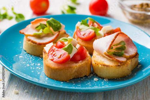 Bruschetta with tomato, cheese and bacon