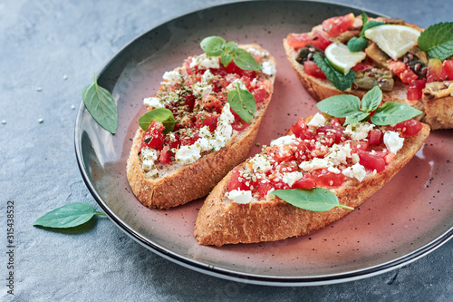 Bruschetta with vegetables and cheese.