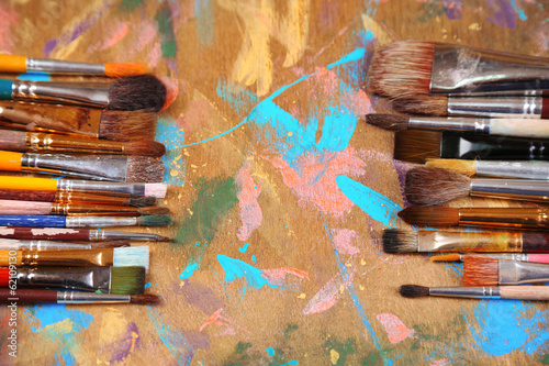 Brushes on multicolor wooden background