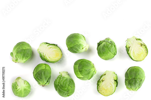 Brussels sprouts isolated on white background with copy space for your text. Top view. Flat lay