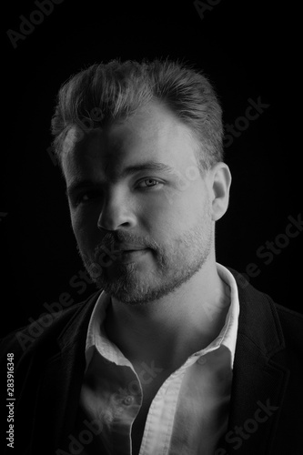 brutal large portrait of a man. businessman in a suit and shirt on a dark background. silhouette. black and white. bw.