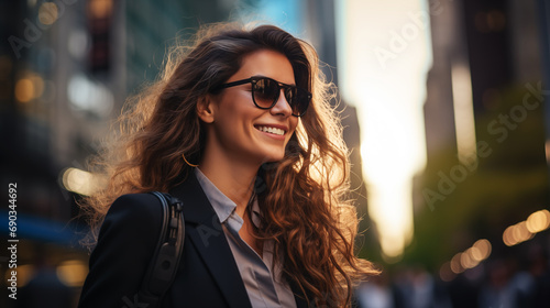 brutal, smiling, confident, professional, businesswoman, leader, modern, business suit, sunglasses, success, street, golden hour
