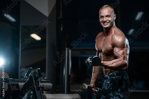 Brutal strong bodybuilder athletic men pumping up muscles with dumbbells.