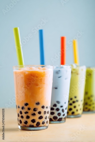 Bubble coffee drink in glass. Trendy iced beverage with foam and tapioca pearls.