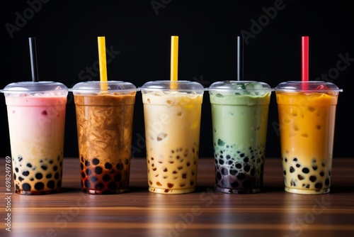 Bubble tea in various settings on dark background, variety of tapioca tea milkshake in a row.