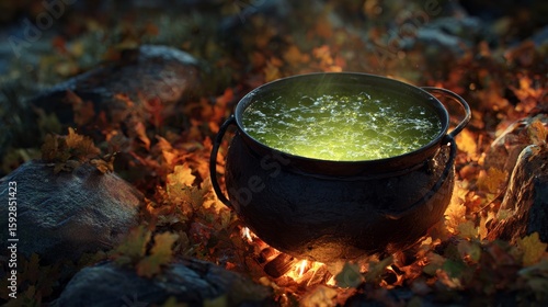 Bubbling cauldron with green potion surrounded by autumn leaves in a mystical forest