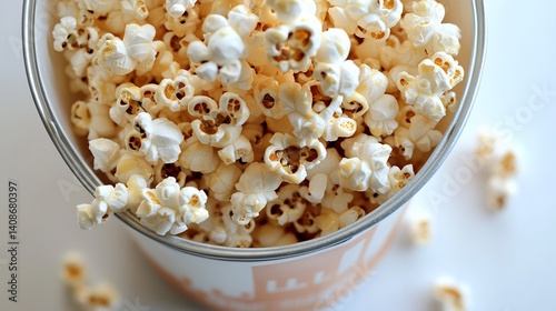 Bucket of buttery popcorn viewed from above with kernels spilling out onto the white surface