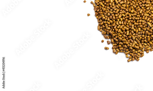 Buckwheat tea on a white background copy space. Isolate. Buckwheat tea close-up macro photography. Scattered buckwheat tea pellets on white background top view.