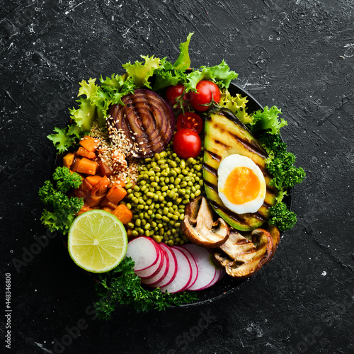 Buddha bowl: Avocado, mung bean, pumpkin, mushrooms, tomatoes and lettuce in a black bowl. Vegan Diet. Top view. Free space for text.