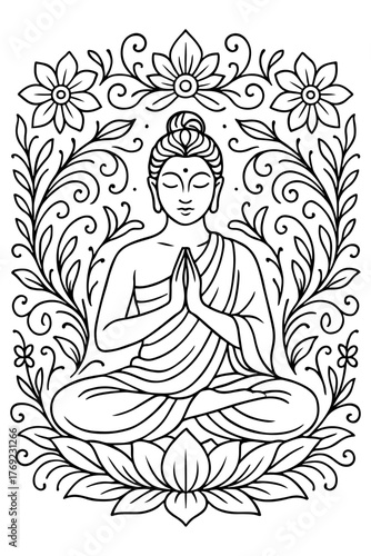 buddha, meditation, zen, peace, calm, serenity, nirvana, spiritual, religion, buddhism, lotus, flower, floral, ornate, decorative, art, illustration, drawing, outline, black, white, monochrome, symbol, icon, figure, person, seated, yoga, pose, gesture, namaste, prayer, devotion, mindfulness, calmness, harmony, balance, nature, growth, life, wisdom, compassion, awakening, nirvana, sacred, divine, grace