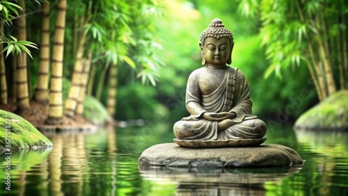buddha statue on a rock in a blurred green bamboo jungle with smooth water surface, fresh natural spa wallpaper concept with asian spirit and copy space