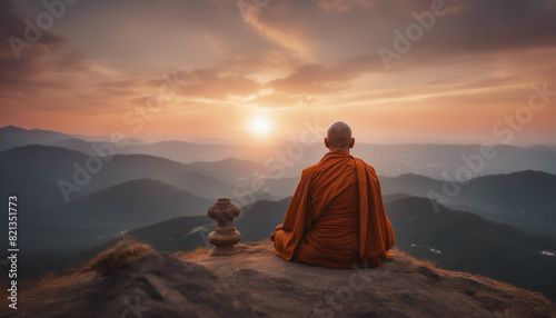 Buddhist monk in meditation at beautiful sunset or sunrise background on high mountain, back view