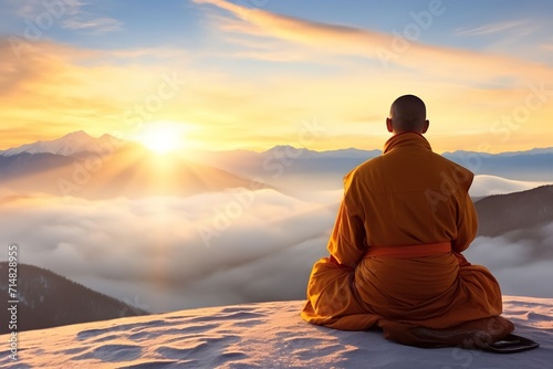 Buddhist monk meditating on a hill