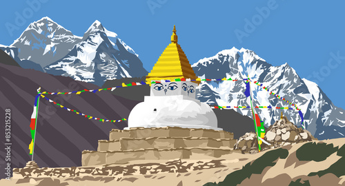 stupa, prayer flags, mountain, himalaya, buddhism, buddhist, ancient, architecture, asia, asian, base camp, buddha, everest, coloured, culture, culture, everest, face, faith, famous, flag, flag, gold, gold, high, hill, himalayan, himalaya, illustration, mantra, monastery, mount, mountain, pray, prayer, religion, religious, rock, stone, symbol, travel, vale