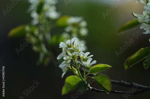 Budding and blooming white branches of an Amelanchier or Shadbush shrub or Serviceberry in the morning