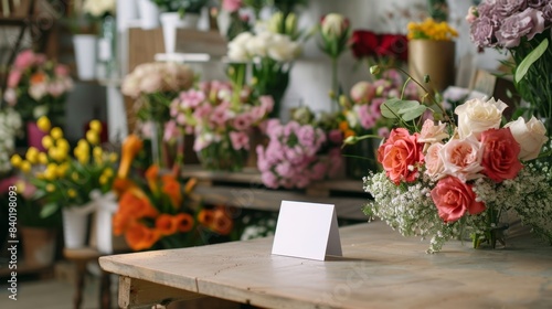 Budding Business Floral Designer's Studio with Fresh Cut Flowers and Blank Business Cards