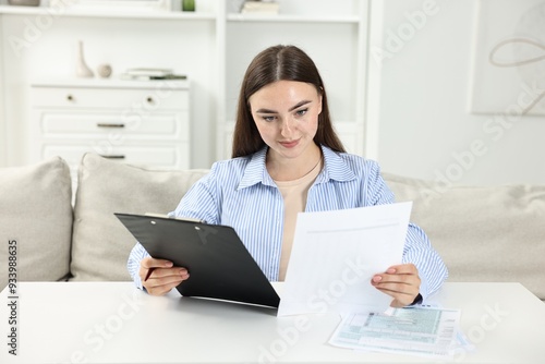 Budget planning. Beautiful young woman with papers at white table indoors