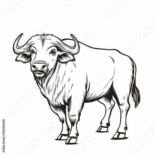 expressive, stylised, posture, powerful, muscular, detailed, ranch, realistic, strong, fluffy, heavy, bold, rough, vignetting, doodle, mammal, outline, standing, wildlife, farm animal, fierce, creature, bull, charge, aggressive, beast, drawing, horn, massive, rural, big, buffalo, grazing, cartoon, wild, white, character, black, animal, hand-drawn, nature, farm, forest, inked