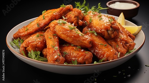 Buffalo wings, detailed view highlighting the crispy textures, front view from above, studio lighting, white background.