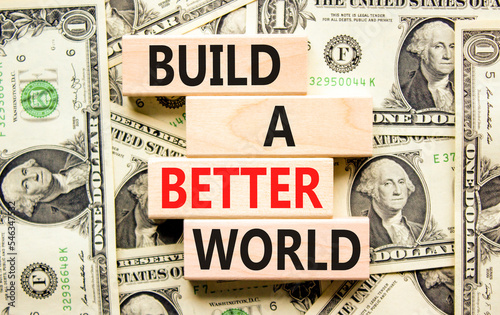 Build a better world symbol. Concept words Build a better world on wooden cubes. Beautiful background from dollar bills. Business build a better world concept. Copy space.