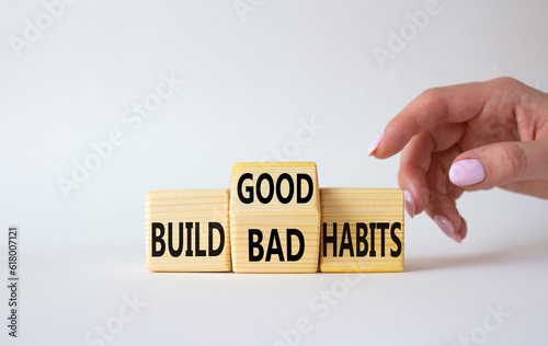 Build Good or Bad Habits symbol. Businessman hand points at wooden cubes with words Build Bad Habits vs Build good Habits. Beautiful white background. Business concept. Copy space